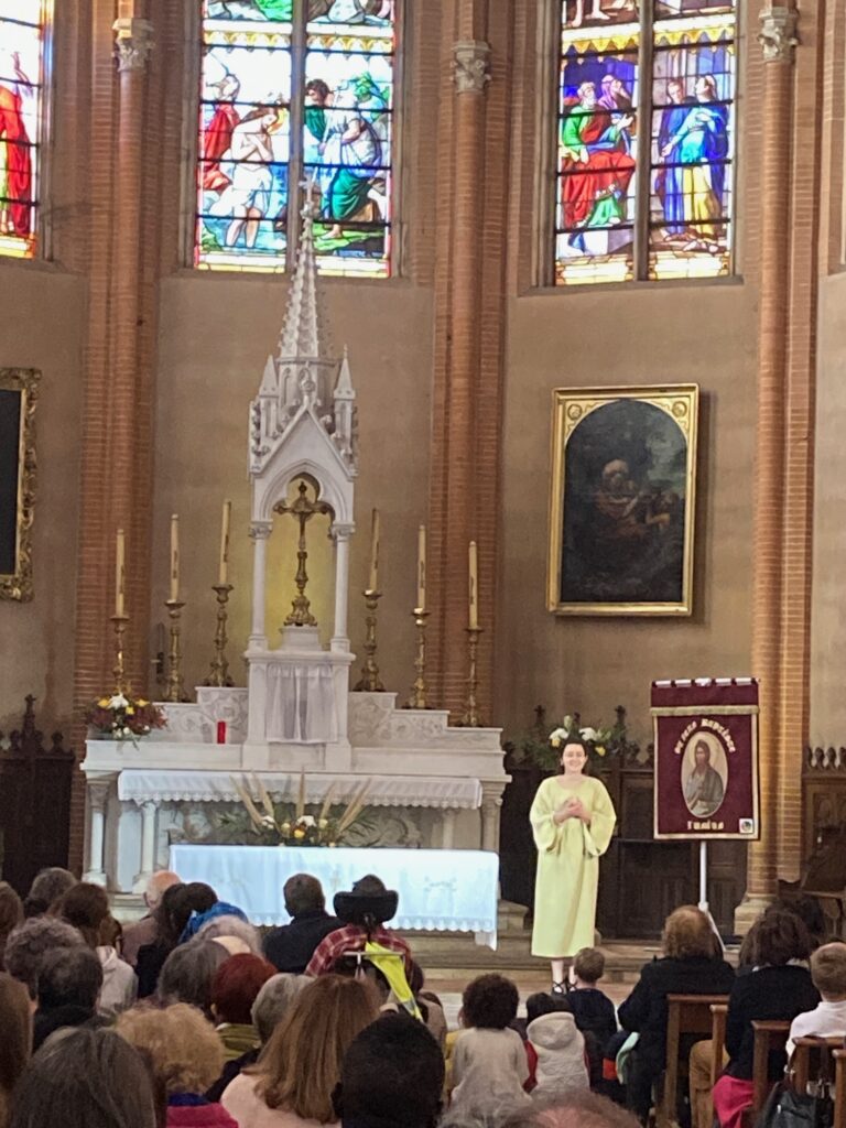 Dès 9h30, des ateliers de danse hébraïque, de catéchèse rythmée, de construction d’icônes, de points de broderie pour bannières, de prière … ont été fréquentés par petits et grands, à la salle Saint Jacques et à l’église. Puis nous avons pu participer activement à une très jolie messe, inspirée de celle présentée à la Daurade avec plusieurs chorales de Toulouse et ses alentours, et bénéficiant d’une procession d’entrée marquée par nos deux nouvelles bannières paroissiales. Colossal travail de notre couturière ! Notre chorale paroissiale a pu mettre à l’honneur différents artistes locaux, compositeurs, musiciens et chanteurs … merci aux techniciens de la sono pour leur efficacité !