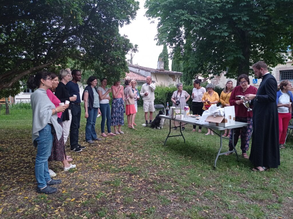Après une belle messe priante et chantante célébrée par le Père Paul, moments de convivialité dans le parc du sanctuaire : apéro, remise au Père Paul du cadeau des Pèlerines et dîner suivi d’une veillée de prières et de chants.